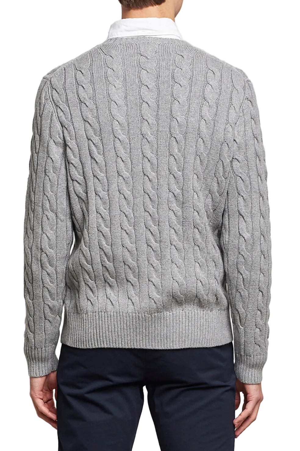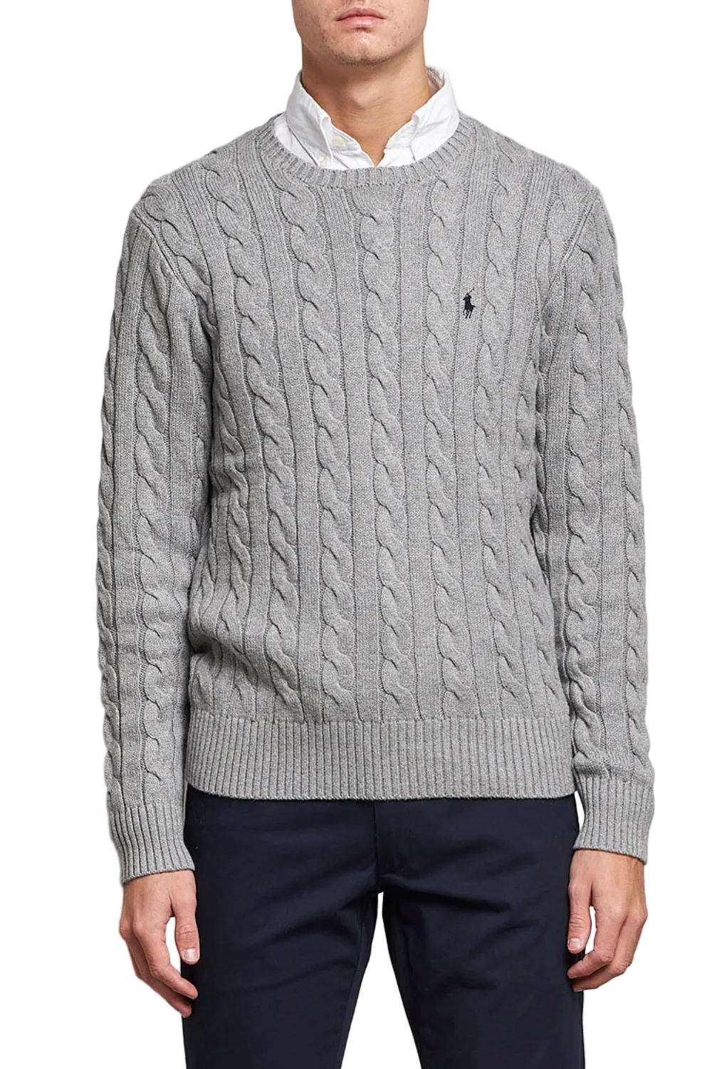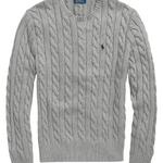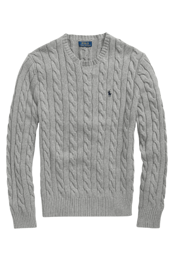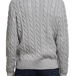 Grey wool-cashmere blend embroidered logo at the chest cable knit ribbed-knit edge crew neck long sleeves straight hem.