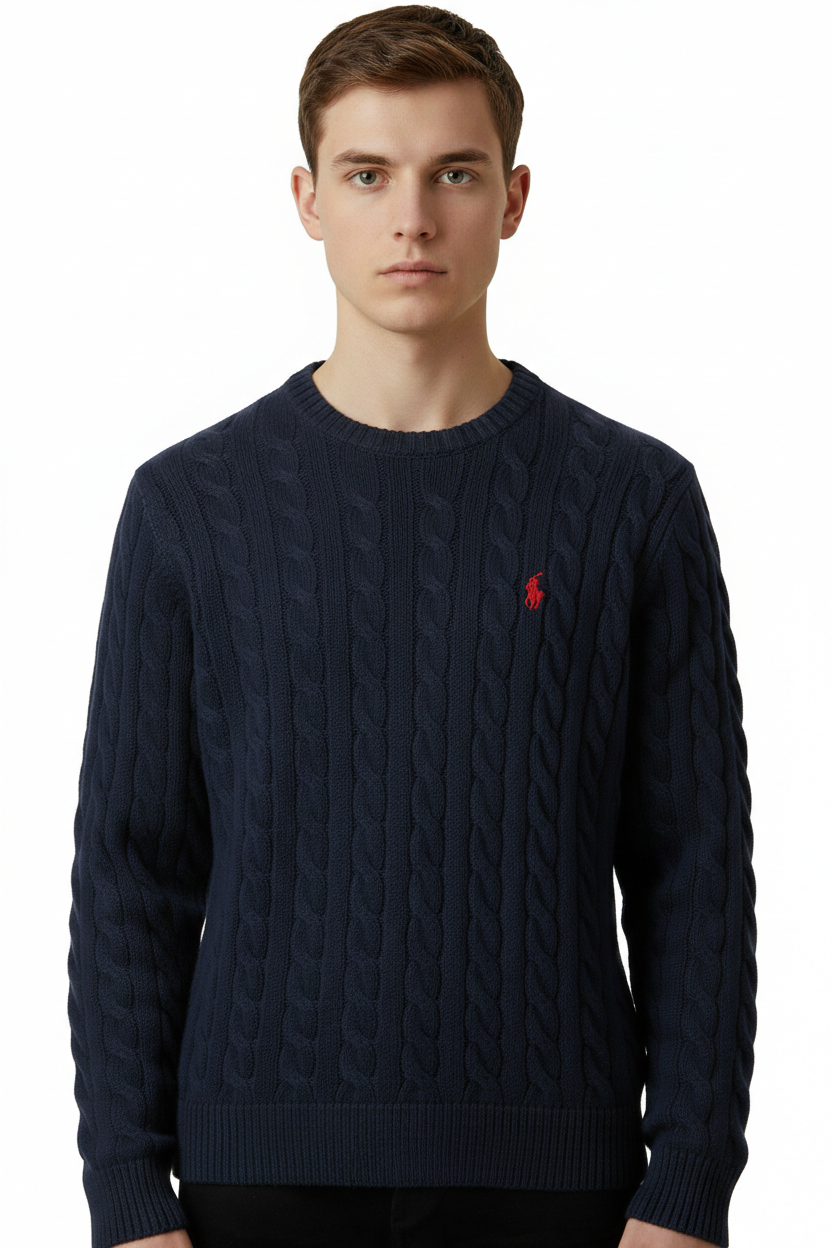 Navy wool-cashmere blend embroidered logo at the chest cable knit ribbed-knit edge crew neck long sleeves straight hem.
