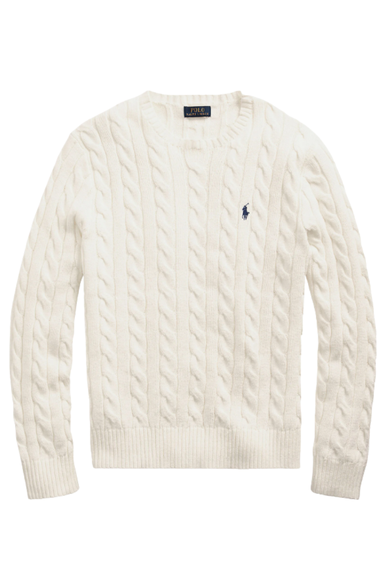 Cream white wool-cashmere blend embroidered logo at the chest cable knit ribbed-knit edge crew neck long sleeves straight hem.